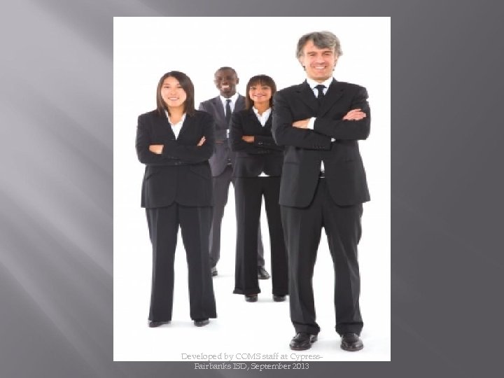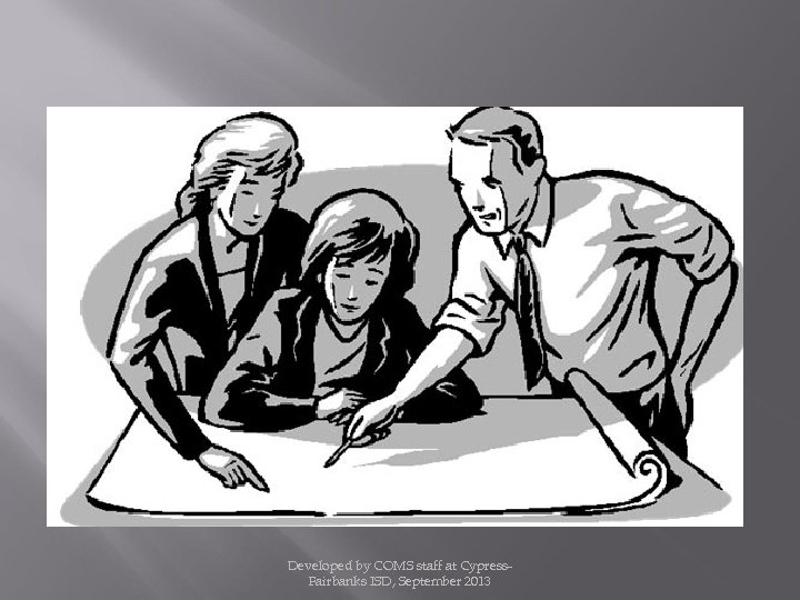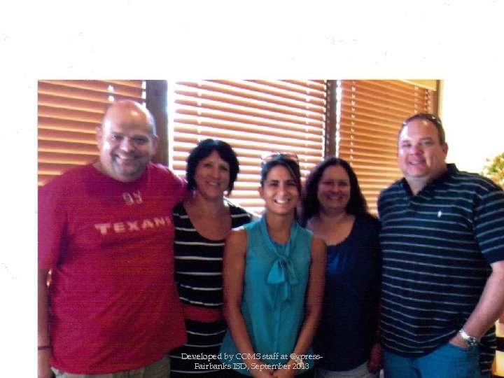 CY-FAIR I. S. D. Donna Lynn Glover, COMS K. C. Crager, COMS Amy Tange, COMS Chuck Holcomb, COMS Meagan Matkin, COMS Developed by COMS staff at Cypress. Fairbanks ISD, September 2013