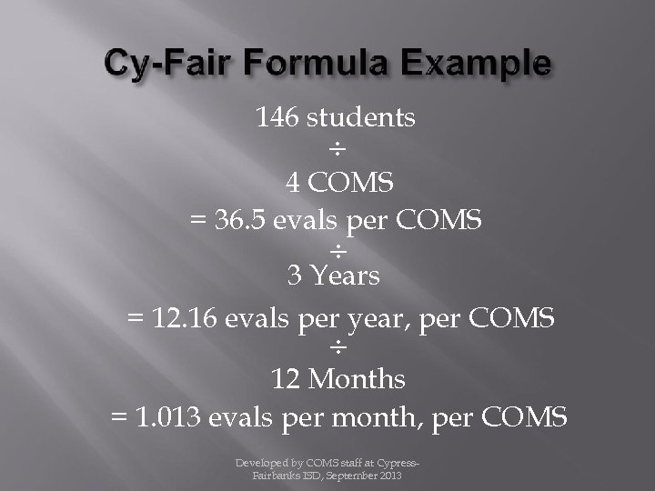146 students ÷ 4 COMS = 36. 5 evals per COMS ÷ 3 Years = 12. 16 evals per year, per COMS ÷ 12 Months = 1. 013 evals per month, per COMS Developed by COMS staff at Cypress. Fairbanks ISD, September 2013