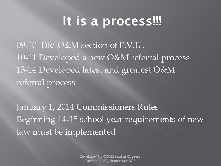 It is a process!!! 09 -10 Did O&M section of F. V. E. 10 -11 Developed a new O&M referral process 13 -14 Developed latest and greatest O&M referral process January 1, 2014 Commissioners Rules Beginning 14 -15 school year requirements of new law must be implemented Developed by COMS staff at Cypress. Fairbanks ISD, September 2013