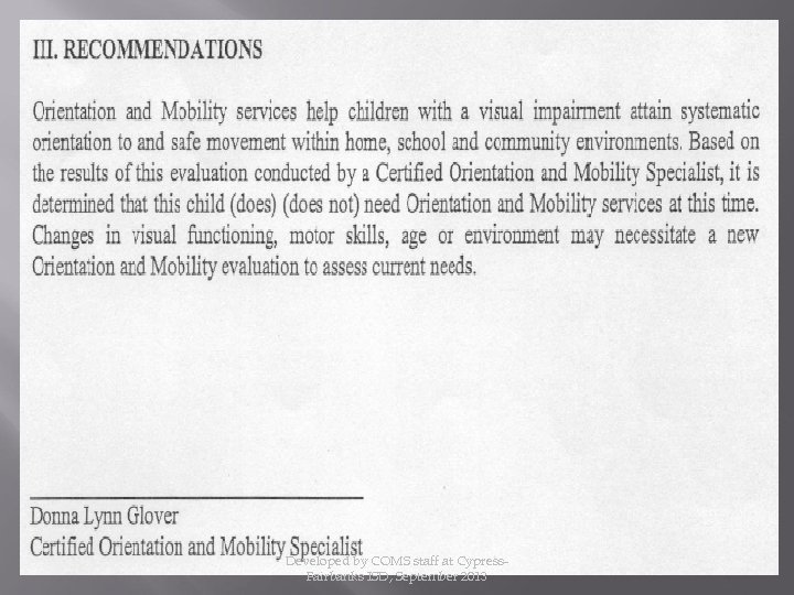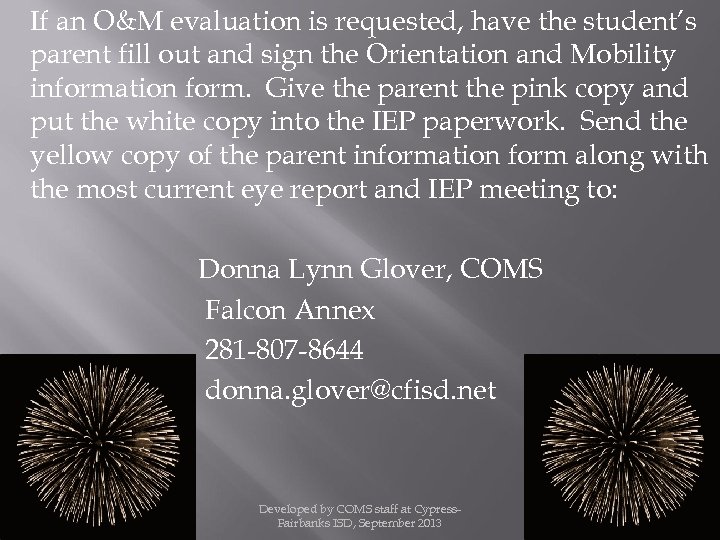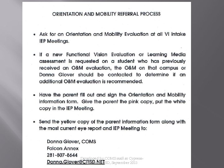 If an O&M evaluation is requested, have the student’s parent fill out and sign the Orientation and Mobility information form. Give the parent the pink copy and put the white copy into the IEP paperwork. Send the yellow copy of the parent information form along with the most current eye report and IEP meeting to: Donna Lynn Glover, COMS Falcon Annex 281 -807 -8644 donna. glover@cfisd. net Developed by COMS staff at Cypress. Fairbanks ISD, September 2013