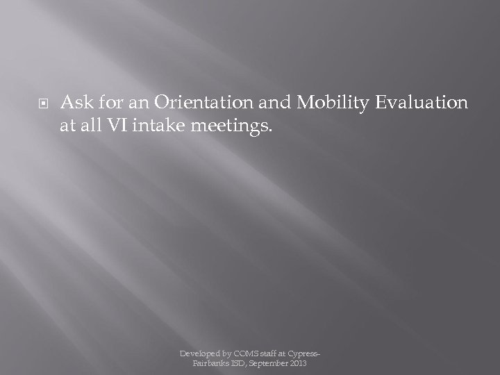 Ask for an Orientation and Mobility Evaluation at all VI intake meetings. Developed by COMS staff at Cypress. Fairbanks ISD, September 2013