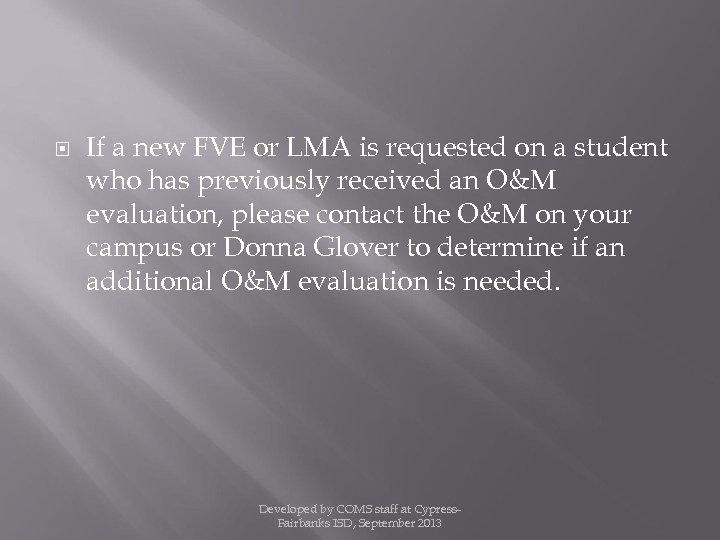 If a new FVE or LMA is requested on a student who has previously received an O&M evaluation, please contact the O&M on your campus or Donna Glover to determine if an additional O&M evaluation is needed. Developed by COMS staff at Cypress. Fairbanks ISD, September 2013
