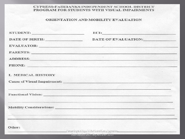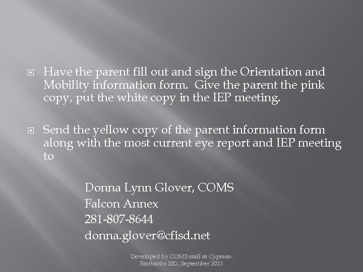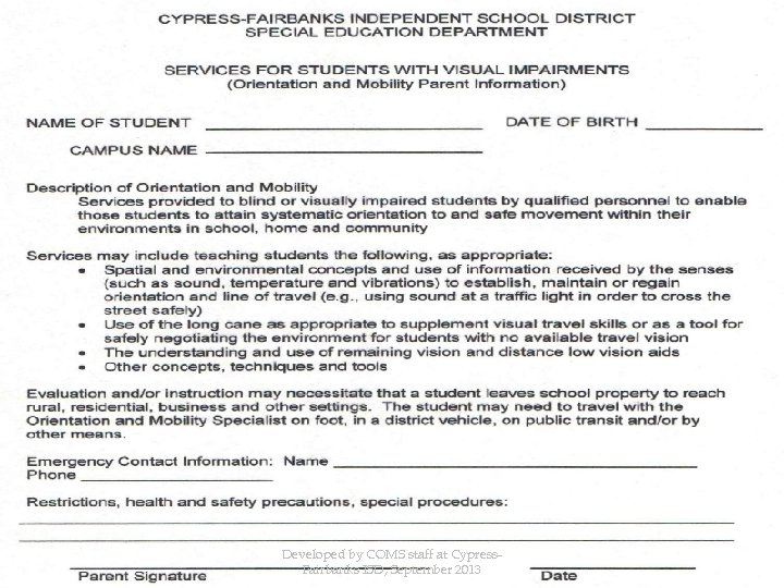 Have the parent fill out and sign the Orientation and Mobility information form. Give the parent the pink copy, put the white copy in the IEP meeting. Send the yellow copy of the parent information form along with the most current eye report and IEP meeting to Donna Lynn Glover, COMS Falcon Annex 281 -807 -8644 donna. glover@cfisd. net Developed by COMS staff at Cypress. Fairbanks ISD, September 2013