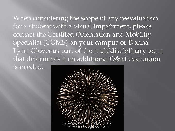 When considering the scope of any reevaluation for a student with a visual impairment, please contact the Certified Orientation and Mobility Specialist (COMS) on your campus or Donna Lynn Glover as part of the multidisciplinary team that determines if an additional O&M evaluation is needed. Developed by COMS staff at Cypress. Fairbanks ISD, September 2013