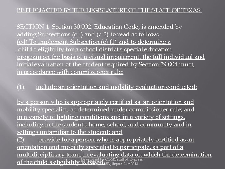 BE IT ENACTED BY THE LEGISLATURE OF THE STATE OF TEXAS: SECTION 1. Section 30. 002, Education Code, is amended by adding Subsections (c-l) and (c-2) to read as follows: (c-l) To implement Subsection (c) (1) and to determine a child's eligibility for a school district's special education program on the basis of a visual impairment, the full individual and initial evaluation of the student required by Section 29. 004 must, in accordance with commissioner rule: (1) include an orientation and mobility evaluation conducted: by a person who is appropriately certified as an orientation and mobility specialist, as determined under commissioner rule; and in a variety of lighting conditions and in a variety of settings, including in the student's home, school, and community and in settings unfamiliar to the student; and (2) provide for a person who is appropriately certified as an orientation and mobility specialist to participate, as part of a multidisciplinary team, in evaluating data on which the determination Developed by COMS staff at Cypressof the child's eligibility is Fairbanks ISD, September 2013 based.