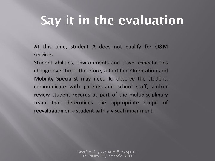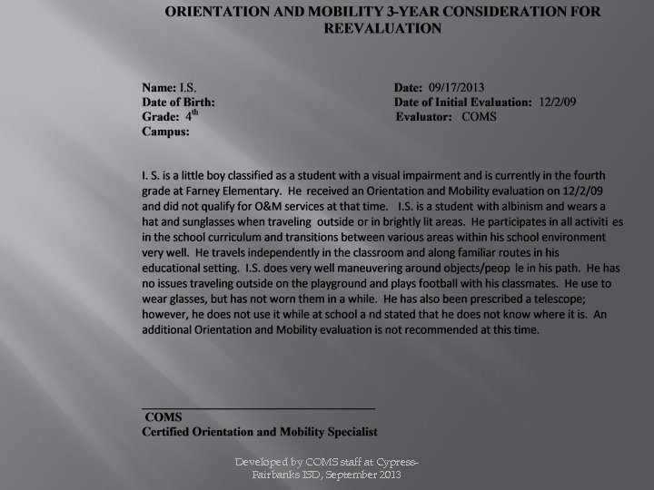 The scope of any reevaluation by a school district of a student who has been determined, after the full individual and initial evaluation, to be eligible for the district’s special education program on the basis of a visual impairment shall be determined by a multidisciplinary team that includes a COMS. Developed by COMS staff at Cypress. Fairbanks ISD, September 2013
