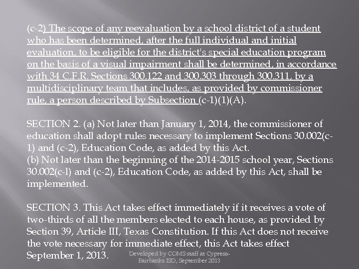 (c-2) The scope of any reevaluation by a school district of a student who has been determined, after the full individual and initial evaluation, to be eligible for the district's special education program on the basis of a visual impairment shall be determined, in accordance with 34 C. F. R. Sections 300. 122 and 300. 303 through 300. 311, by a multidisciplinary team that includes, as provided by commissioner rule, a person described by Subsection (c-1)(1)(A). SECTION 2. (a) Not later than January 1, 2014, the commissioner of education shall adopt rules necessary to implement Sections 30. 002(c 1) and (c-2), Education Code, as added by this Act. (b) Not later than the beginning of the 2014 -2015 school year, Sections 30. 002(c-l) and (c-2), Education Code, as added by this Act, shall be implemented. SECTION 3. This Act takes effect immediately if it receives a vote of two-thirds of all the members elected to each house, as provided by Section 39, Article III, Texas Constitution. If this Act does not receive the vote necessary for immediate effect, this Act takes effect Developed by COMS staff at Cypress. September 1, 2013. Fairbanks ISD, September 2013