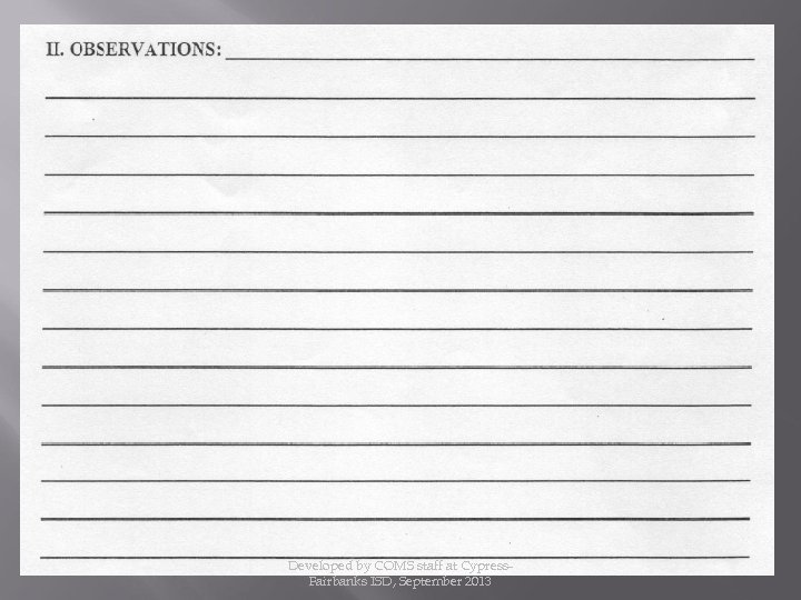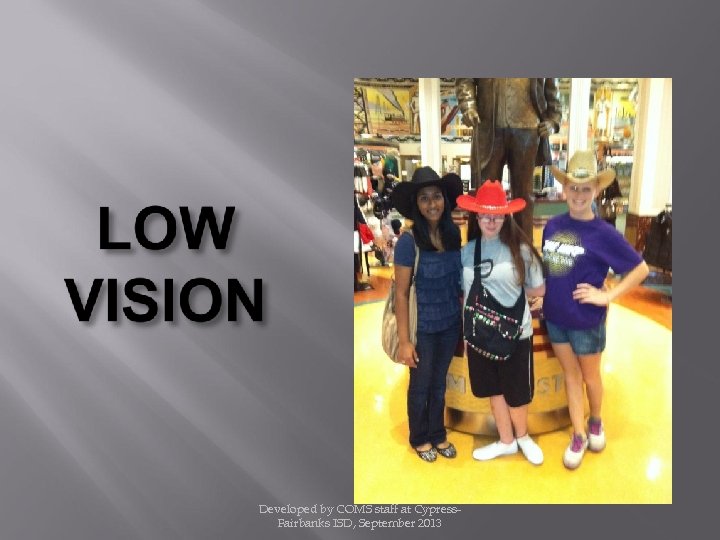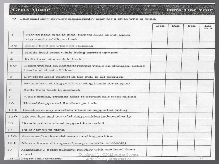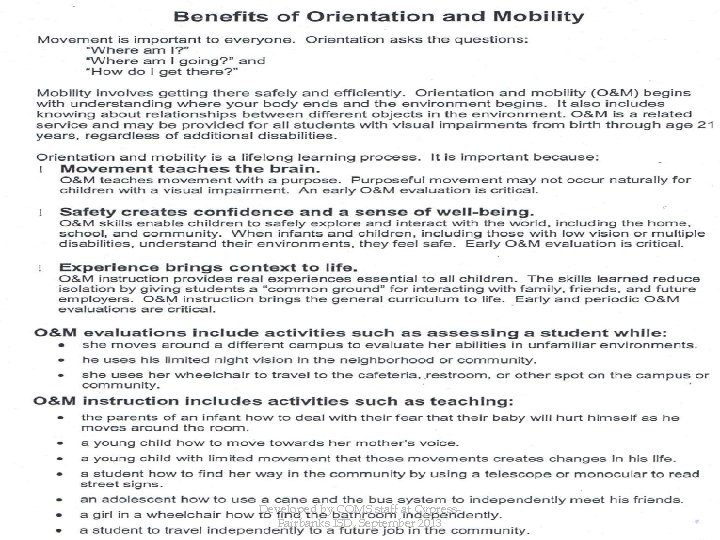 Developed by Texas School for the Blind and Visually Impaired & the Professional Preparation Advisory Group Edited by KC Dignan www. tsbvi. edu/Education/om-benefits. htm Developed by COMS staff at Cypress. Fairbanks ISD, September 2013