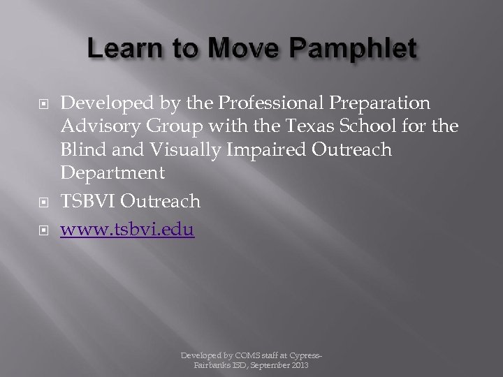 Developed by the Professional Preparation Advisory Group with the Texas School for the Blind and Visually Impaired Outreach Department TSBVI Outreach www. tsbvi. edu Developed by COMS staff at Cypress. Fairbanks ISD, September 2013