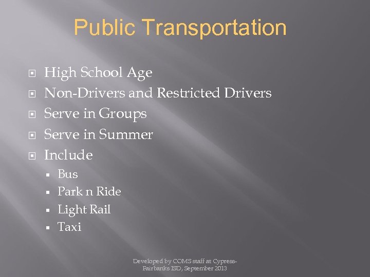 Public Transportation High School Age Non-Drivers and Restricted Drivers Serve in Groups Serve in Summer Include Bus Park n Ride Light Rail Taxi Developed by COMS staff at Cypress. Fairbanks ISD, September 2013
