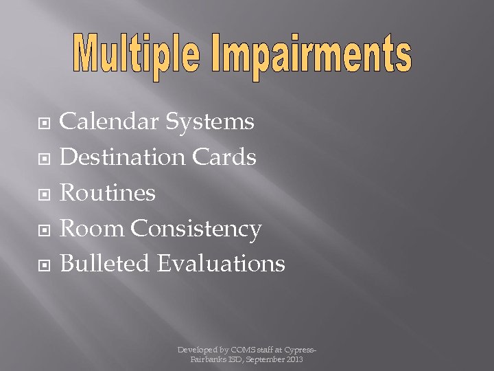 Calendar Systems Destination Cards Routines Room Consistency Bulleted Evaluations Developed by COMS staff at Cypress. Fairbanks ISD, September 2013