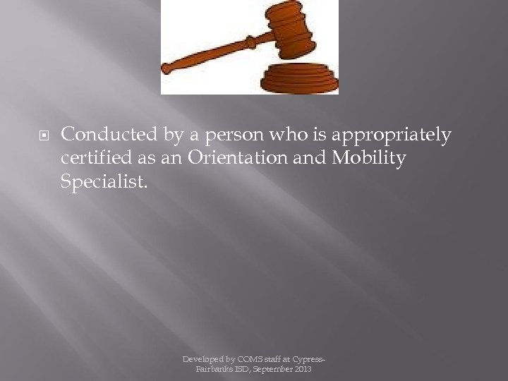 Conducted by a person who is appropriately certified as an Orientation and Mobility Specialist. Developed by COMS staff at Cypress. Fairbanks ISD, September 2013