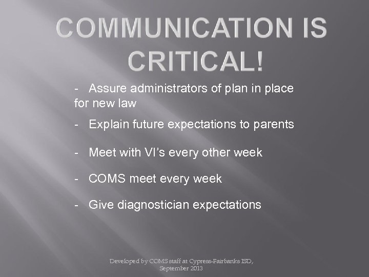 - Assure administrators of plan in place for new law - Explain future expectations to parents - Meet with VI’s every other week - COMS meet every week - Give diagnostician expectations Developed by COMS staff at Cypress-Fairbanks ISD, September 2013