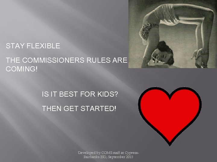 STAY FLEXIBLE THE COMMISSIONERS RULES ARE COMING! IS IT BEST FOR KIDS? THEN GET STARTED! Developed by COMS staff at Cypress. Fairbanks ISD, September 2013