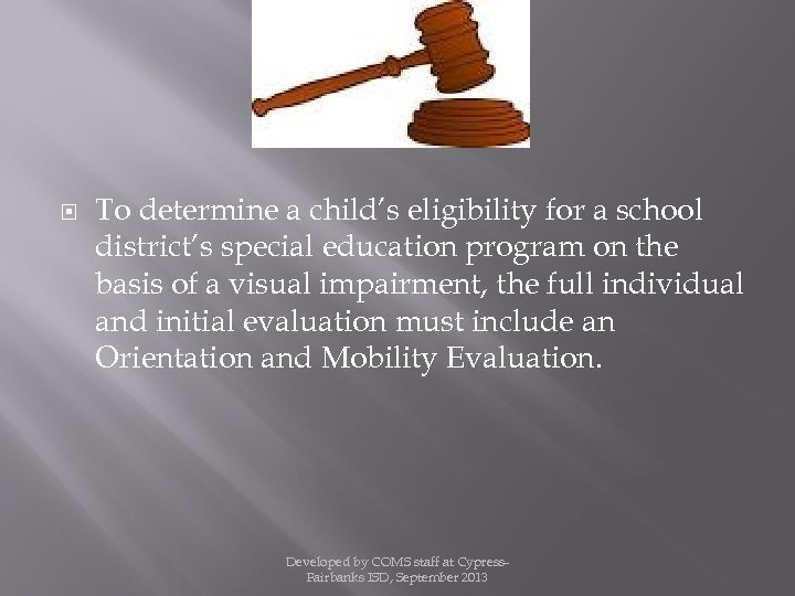 To determine a child’s eligibility for a school district’s special education program on the basis of a visual impairment, the full individual and initial evaluation must include an Orientation and Mobility Evaluation. Developed by COMS staff at Cypress. Fairbanks ISD, September 2013