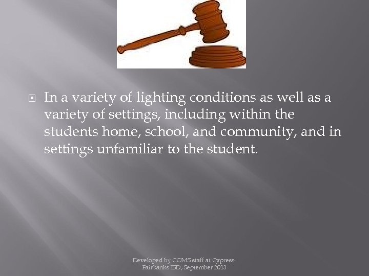 In a variety of lighting conditions as well as a variety of settings, including within the students home, school, and community, and in settings unfamiliar to the student. Developed by COMS staff at Cypress. Fairbanks ISD, September 2013