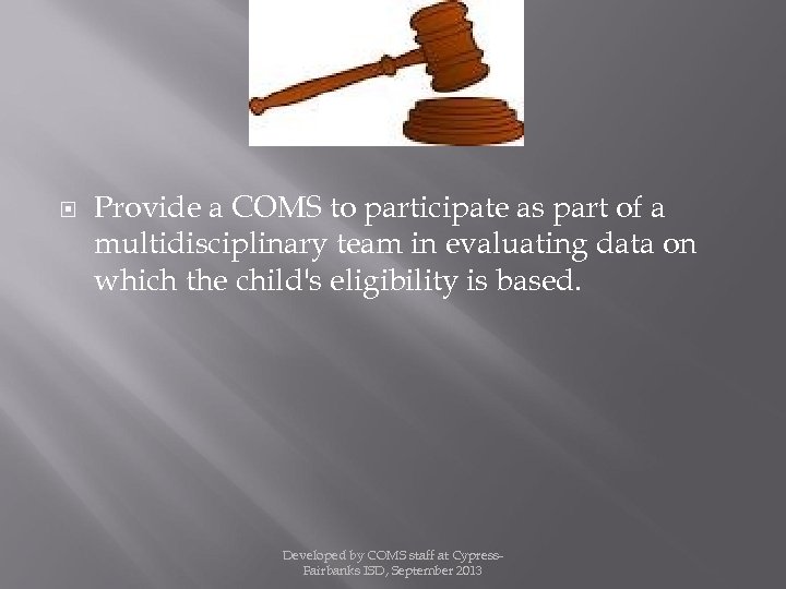Provide a COMS to participate as part of a multidisciplinary team in evaluating data on which the child's eligibility is based. Developed by COMS staff at Cypress. Fairbanks ISD, September 2013