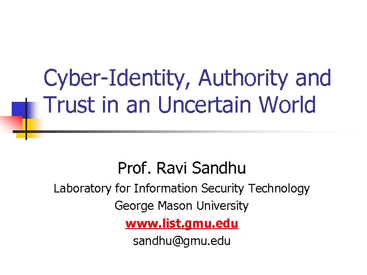 Cyber-Identity, Authority and Trust in an Uncertain World Prof. Ravi Sandhu Laboratory for Information Security Technology George Mason University www. list. gmu. edu sandhu@gmu. edu