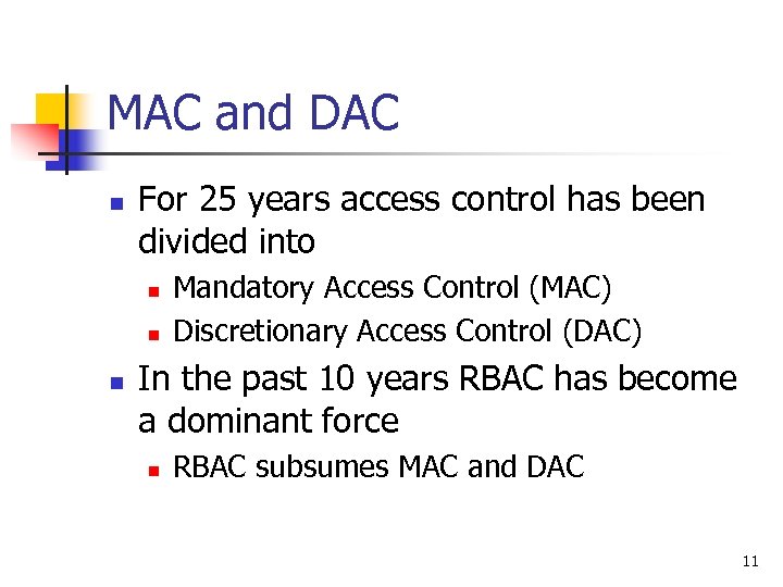 MAC and DAC n For 25 years access control has been divided into n n n Mandatory Access Control (MAC) Discretionary Access Control (DAC) In the past 10 years RBAC has become a dominant force n RBAC subsumes MAC and DAC 11