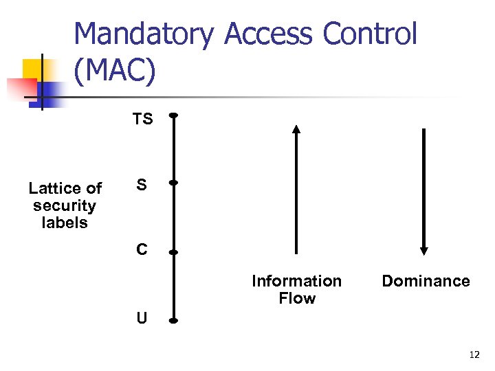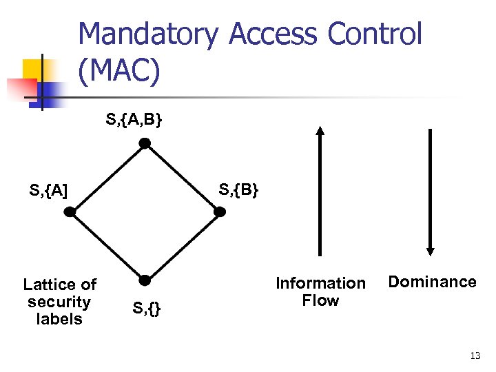 Mandatory Access Control (MAC) TS Lattice of security labels S C Information Flow Dominance U 12