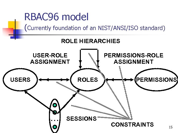 RBAC 96 model (Currently foundation of an NIST/ANSI/ISO standard) ROLE HIERARCHIES USER-ROLE ASSIGNMENT USERS PERMISSIONS-ROLE ASSIGNMENT ROLES . . . SESSIONS PERMISSIONS CONSTRAINTS 15