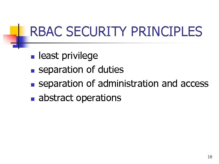 RBAC SECURITY PRINCIPLES n n least privilege separation of duties separation of administration and access abstract operations 16