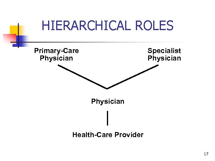 HIERARCHICAL ROLES Primary-Care Physician Specialist Physician Health-Care Provider 17