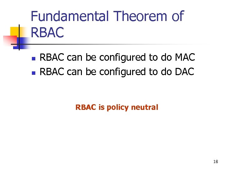 Fundamental Theorem of RBAC n n RBAC can be configured to do MAC RBAC can be configured to do DAC RBAC is policy neutral 18