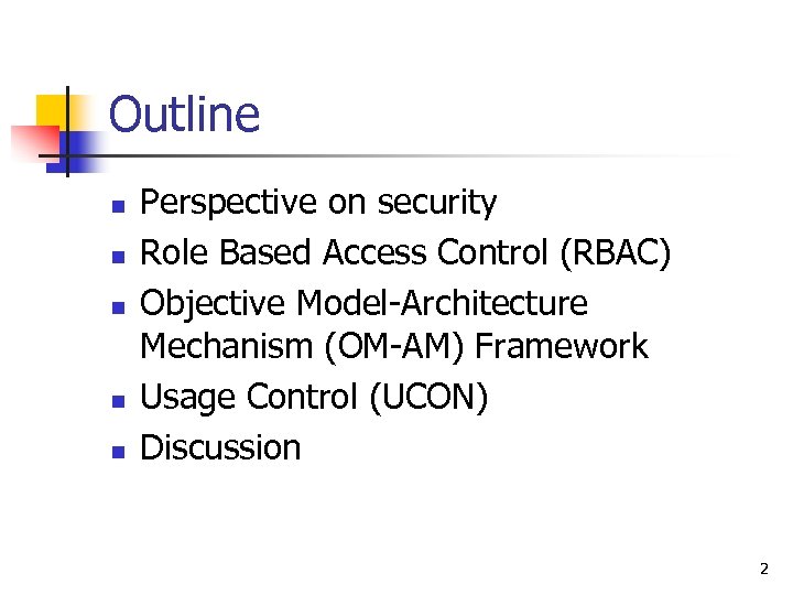 Outline n n n Perspective on security Role Based Access Control (RBAC) Objective Model-Architecture Mechanism (OM-AM) Framework Usage Control (UCON) Discussion 2