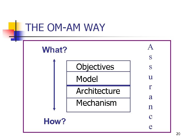 THE OM-AM WAY What? Objectives Model Architecture Mechanism How? A s s u r a n c e 20