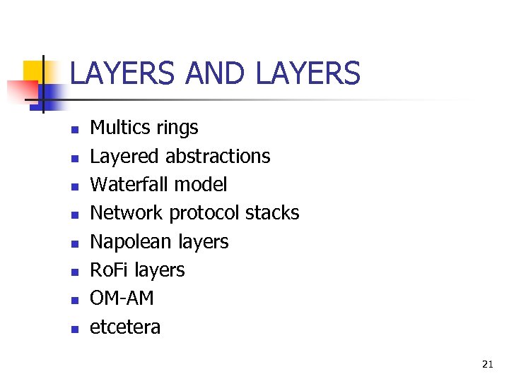 LAYERS AND LAYERS n n n n Multics rings Layered abstractions Waterfall model Network protocol stacks Napolean layers Ro. Fi layers OM-AM etcetera 21