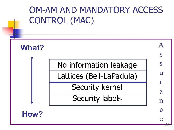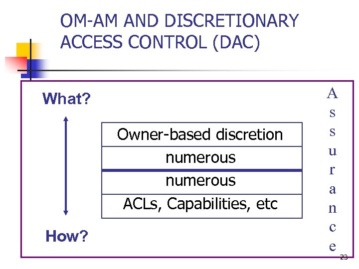 OM-AM AND MANDATORY ACCESS CONTROL (MAC) What? No information leakage Lattices (Bell-La. Padula) Security kernel Security labels How? A s s u r a n c e 22