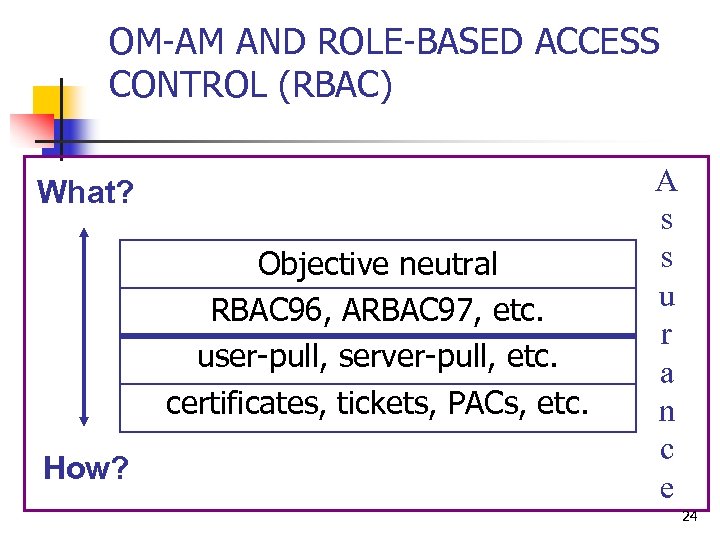 OM-AM AND ROLE-BASED ACCESS CONTROL (RBAC) What? Objective neutral RBAC 96, ARBAC 97, etc. user-pull, server-pull, etc. certificates, tickets, PACs, etc. How? A s s u r a n c e 24