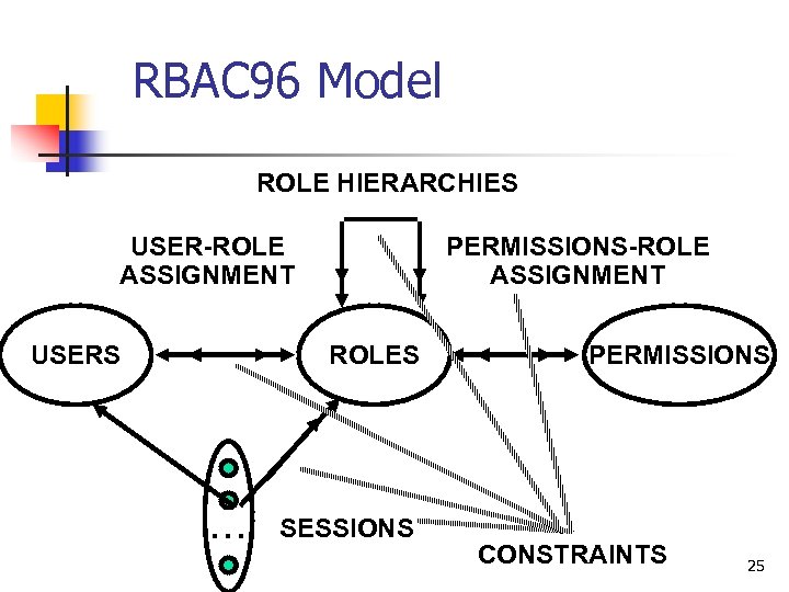 RBAC 96 Model ROLE HIERARCHIES USER-ROLE ASSIGNMENT USERS PERMISSIONS-ROLE ASSIGNMENT ROLES . . . SESSIONS PERMISSIONS CONSTRAINTS 25