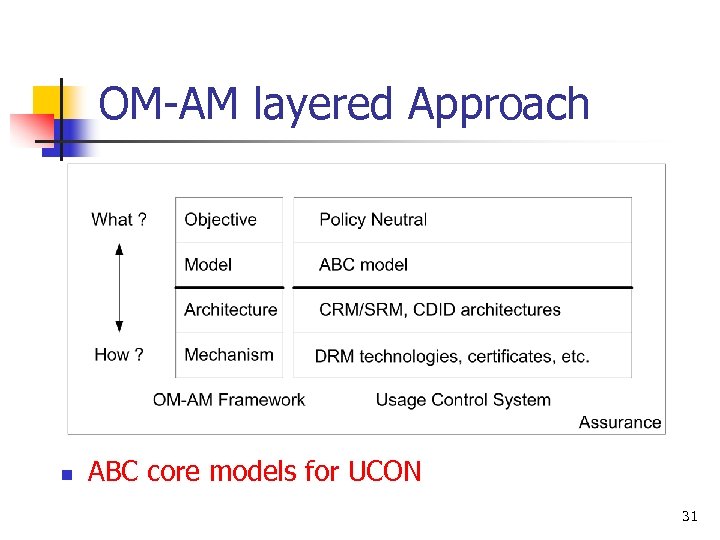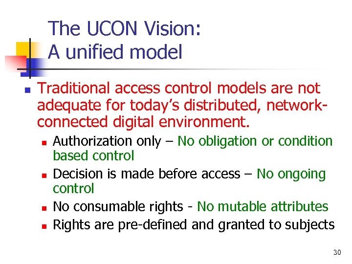 The UCON Vision: A unified model n Traditional access control models are not adequate for today’s distributed, networkconnected digital environment. n n Authorization only – No obligation or condition based control Decision is made before access – No ongoing control No consumable rights - No mutable attributes Rights are pre-defined and granted to subjects 30