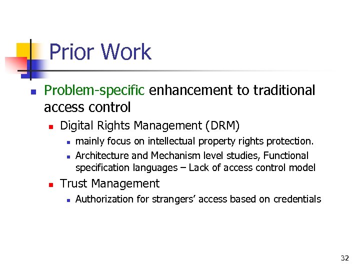 Prior Work n Problem-specific enhancement to traditional access control n Digital Rights Management (DRM) n n n mainly focus on intellectual property rights protection. Architecture and Mechanism level studies, Functional specification languages – Lack of access control model Trust Management n Authorization for strangers’ access based on credentials 32