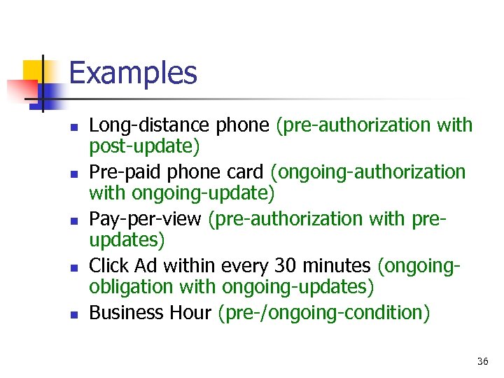 Examples n n n Long-distance phone (pre-authorization with post-update) Pre-paid phone card (ongoing-authorization with ongoing-update) Pay-per-view (pre-authorization with preupdates) Click Ad within every 30 minutes (ongoingobligation with ongoing-updates) Business Hour (pre-/ongoing-condition) 36