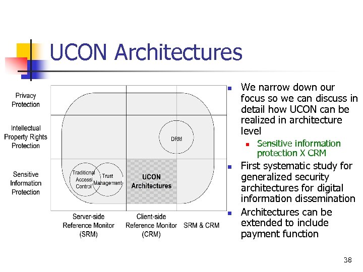 UCON Architectures n We narrow down our focus so we can discuss in detail how UCON can be realized in architecture level n n n Sensitive information protection X CRM First systematic study for generalized security architectures for digital information dissemination Architectures can be extended to include payment function 38