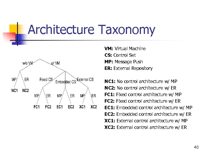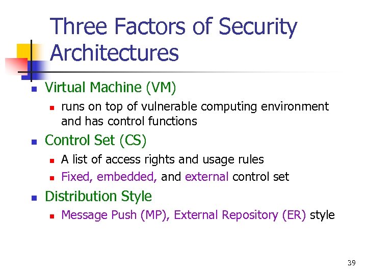 Three Factors of Security Architectures n Virtual Machine (VM) n n Control Set (CS) n n n runs on top of vulnerable computing environment and has control functions A list of access rights and usage rules Fixed, embedded, and external control set Distribution Style n Message Push (MP), External Repository (ER) style 39