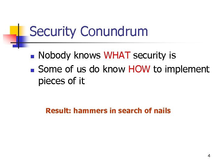 Security Conundrum n n Nobody knows WHAT security is Some of us do know HOW to implement pieces of it Result: hammers in search of nails 4