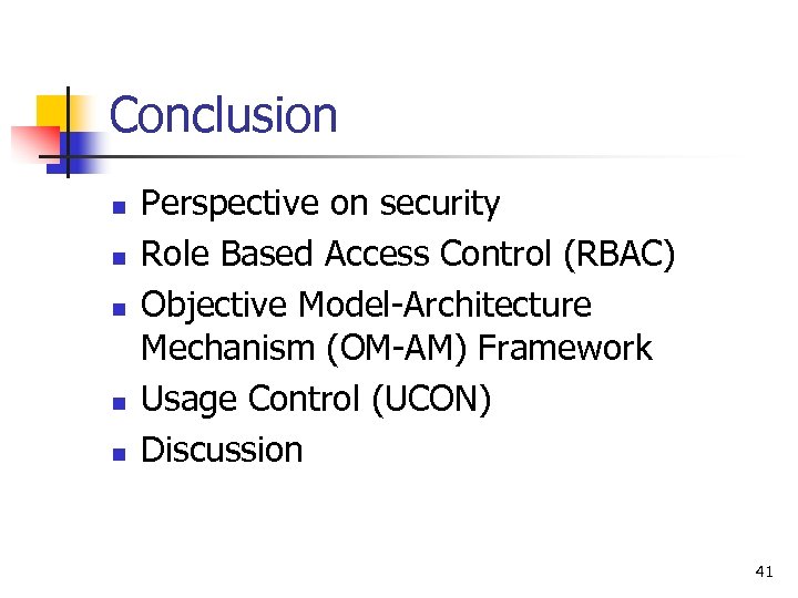 Conclusion n n Perspective on security Role Based Access Control (RBAC) Objective Model-Architecture Mechanism (OM-AM) Framework Usage Control (UCON) Discussion 41