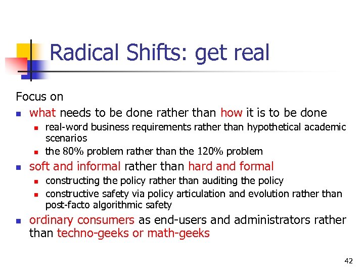 Radical Shifts: get real Focus on n what needs to be done rather than how it is to be done n n n soft and informal rather than hard and formal n n n real-word business requirements rather than hypothetical academic scenarios the 80% problem rather than the 120% problem constructing the policy rather than auditing the policy constructive safety via policy articulation and evolution rather than post-facto algorithmic safety ordinary consumers as end-users and administrators rather than techno-geeks or math-geeks 42