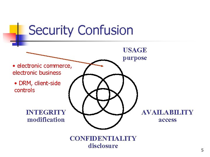 Security Confusion USAGE purpose • electronic commerce, electronic business • DRM, client-side controls INTEGRITY modification AVAILABILITY access CONFIDENTIALITY disclosure 5