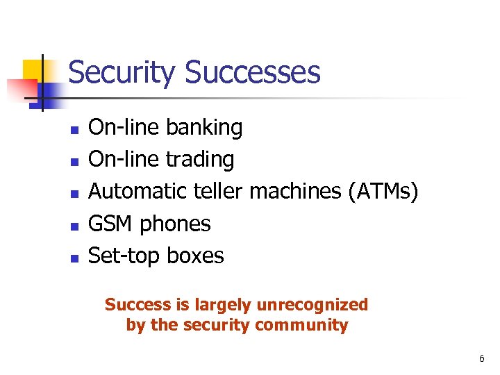 Security Successes n n n On-line banking On-line trading Automatic teller machines (ATMs) GSM phones Set-top boxes Success is largely unrecognized by the security community 6