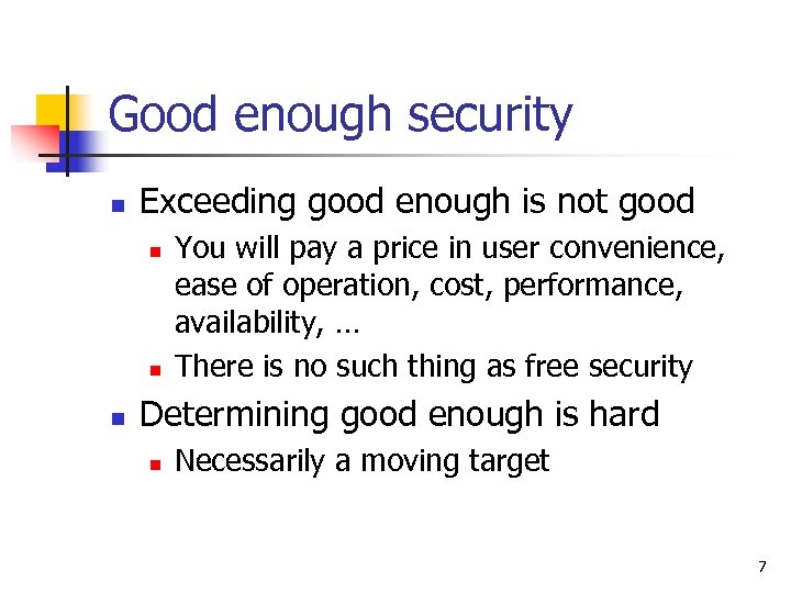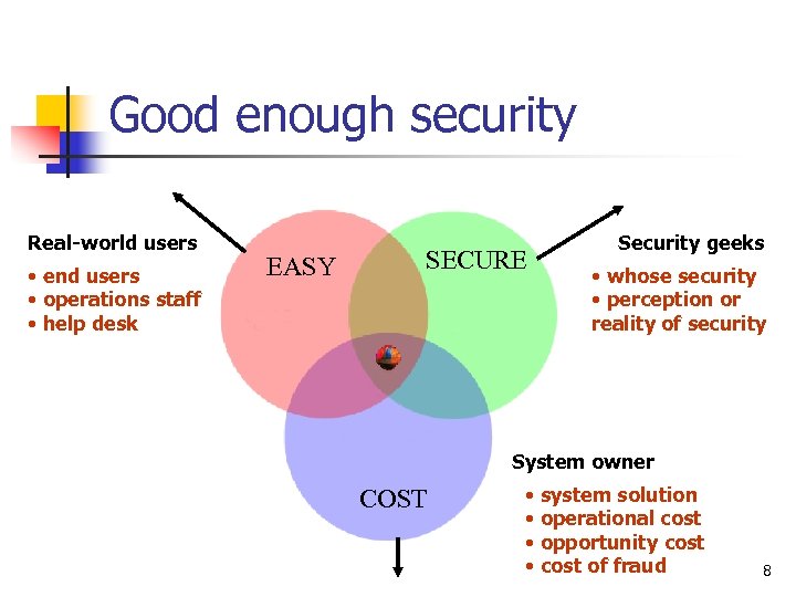 Good enough security n Exceeding good enough is not good n n n You will pay a price in user convenience, ease of operation, cost, performance, availability, … There is no such thing as free security Determining good enough is hard n Necessarily a moving target 7