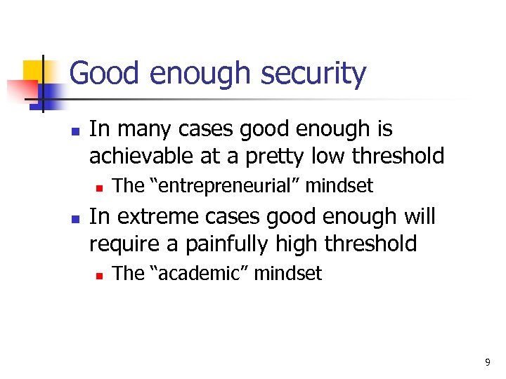 Good enough security n In many cases good enough is achievable at a pretty low threshold n n The “entrepreneurial” mindset In extreme cases good enough will require a painfully high threshold n The “academic” mindset 9