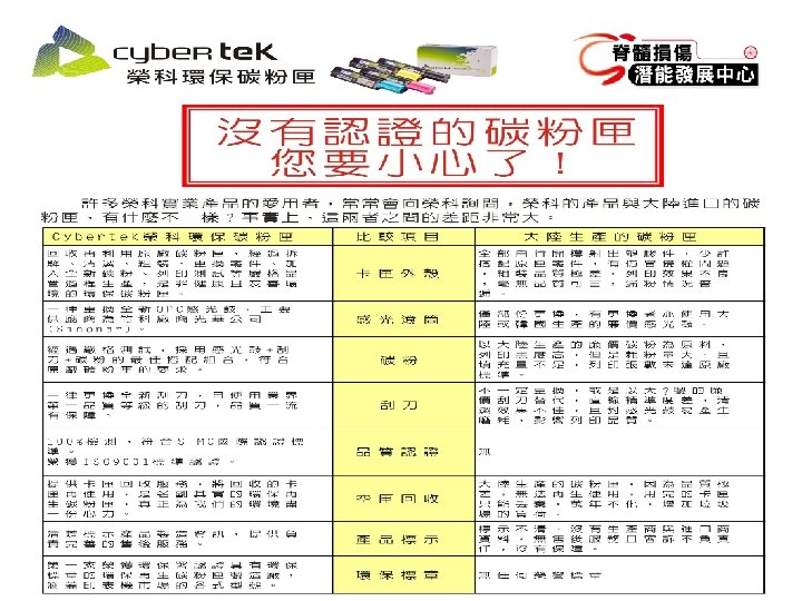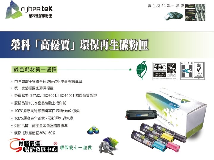 如何分辨真正的環保碳粉匣 真正的環保產品不僅是具有環保概念 (Concept) 更要具備環保的標準 (Standard)及驗證 (Evaluation)… 例如: §具備國家環保標章 §具備廢棄物通案回收再利用證照,專業空匣回收 §具備歐美國際 STMC等標準化 100%檢測 §嚴格品管,通過 ISO 9001品質系統認證 ?