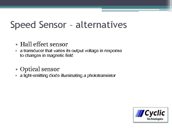 Speed Sensor – alternatives • Hall effect sensor • a transducer that varies its output voltage in response to changes in magnetic field • Optical sensor • a light-emitting diode illuminating a phototransistor