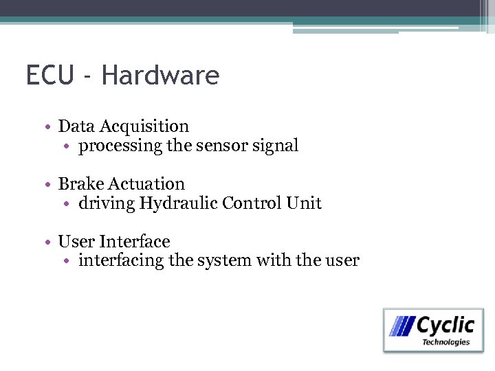 ECU - Hardware • Data Acquisition • processing the sensor signal • Brake Actuation • driving Hydraulic Control Unit • User Interface • interfacing the system with the user