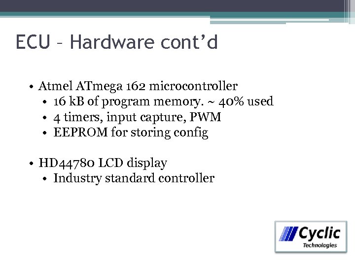 ECU – Hardware cont’d • Atmel ATmega 162 microcontroller • 16 k. B of program memory. ~ 40% used • 4 timers, input capture, PWM • EEPROM for storing config • HD 44780 LCD display • Industry standard controller